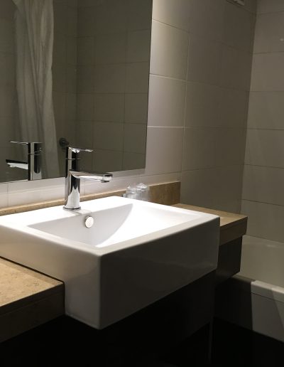 Confortable y espaciosa habitación de estilo minimalista, decorada con nobles materiales.